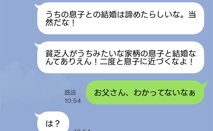 「はぁ……相変わらずですね」「息子さんはやさしくて素敵な人なのに、父親があなたのような人で非常に残念です」と返すと、「俺だって息子が連れてきた女が貧乏人でがっかりしたよ」「金目当てのために玄関先で必死に騒ぐ姿はこっけいだったな」と向こうも言い返してきました。