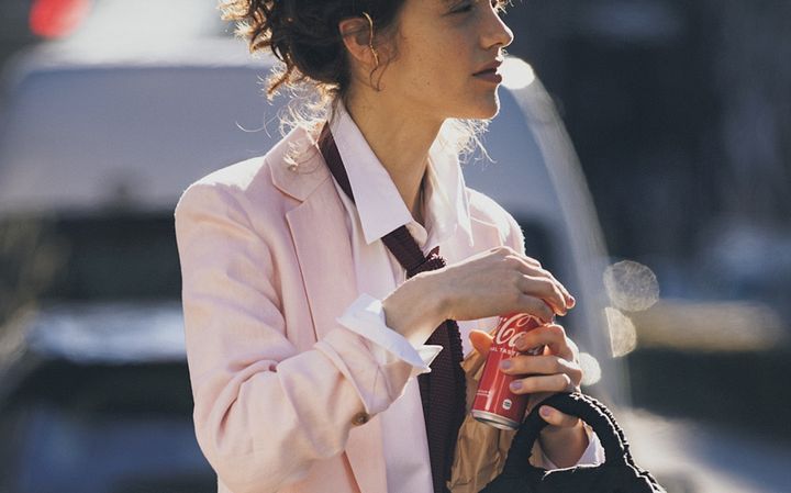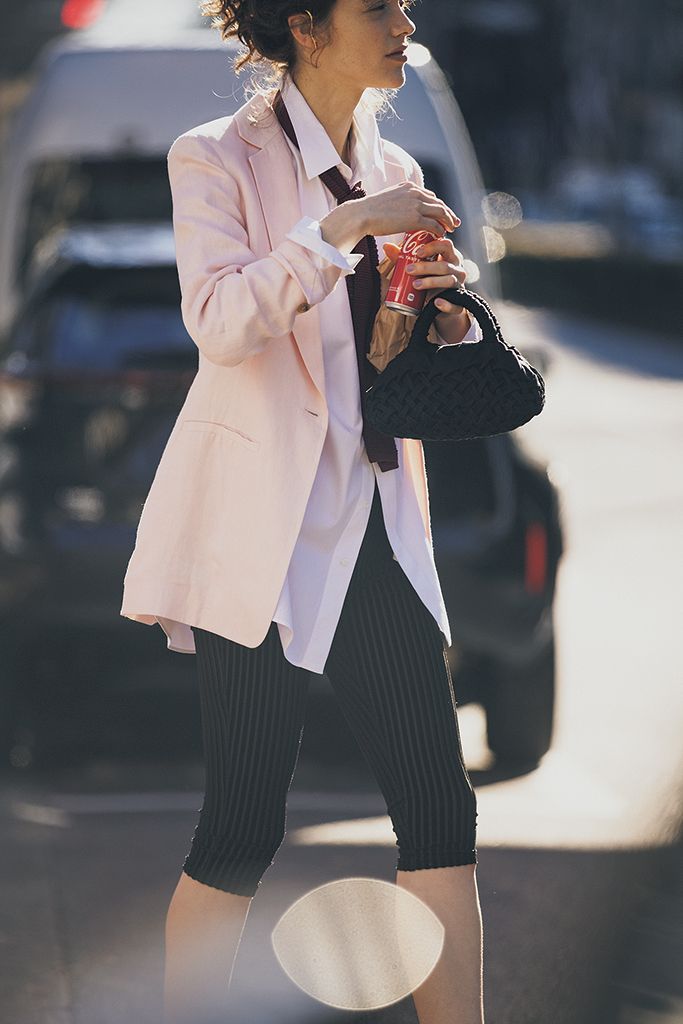 ピンクジャケット/BARBA NAPOLI(コロネット) 黒ハーフレギンス/SIMONE WILD/エディットフォールル(ベイクルーズ カスタマーサポート) 体のラインが出るレギンスには、肩パッドの入った長めの丈を羽織ると安心。サーモンピンクのやさしい雰囲気も味方に。ロングシャツにネクタイを締めて、奥行きを演出。
