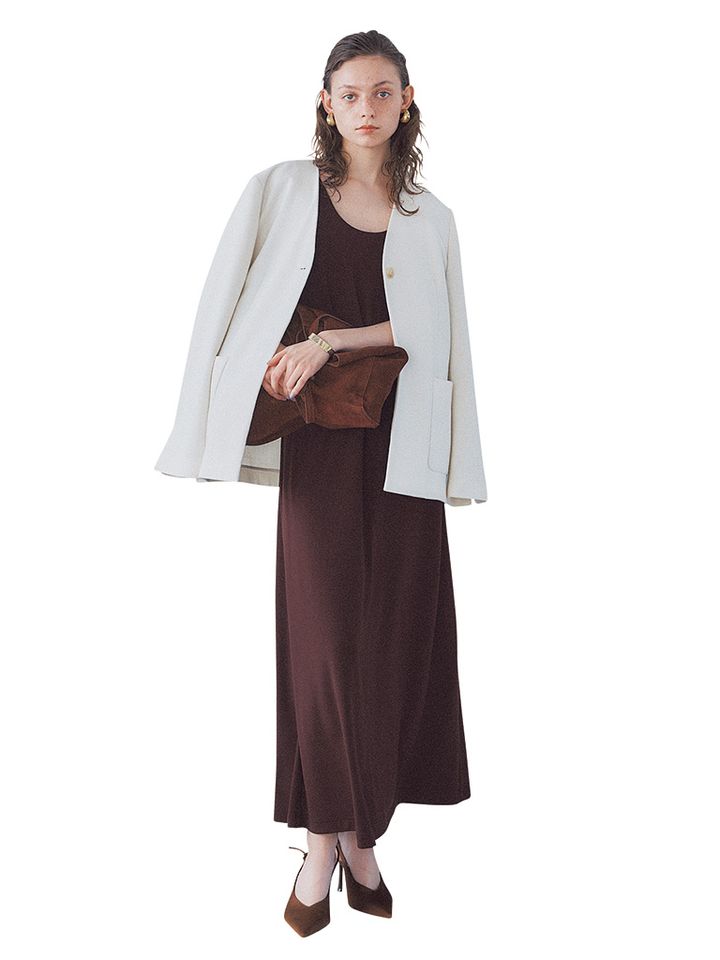 ブラウンカップインノースリーブワンピース/LE PHIL(LE PHIL NE WoMan新宿店) 白ノーカラージャケット/バビロン(バビロン新宿) すっきりと着られる、端正なノーカラーデザイン。スリット入りのそで口やスクエアポケットのディティールが、白を間のびさせずシャープな見た目を後押し。ボタン位置がやや高めに設定されているから、羽織っただけで縦長な印象に。シワになりにくい、ツイード風のポリエステル素材。