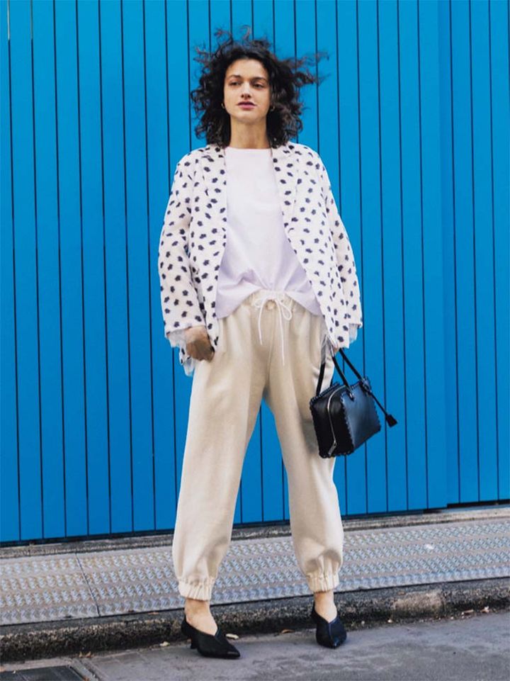 白フラワー柄シアージャケット/MAISON SPECIAL(メゾンスペシャル 青山店) スウェットパンツ/ATON(ATON AOYAMA) なにを選んでも好感度をくずさないジャケットだからこそ、安定感を保ったまま気分転換。クリアな白のオーガンジー素材に黒の小花柄で、かわいげと潔さをあわせもつジャケット。インパクトの強い総柄も白黒軸なら手持ちの服ともなじみやすい。ライトに着られる薄手素材だから、春夏の羽織としても重宝。