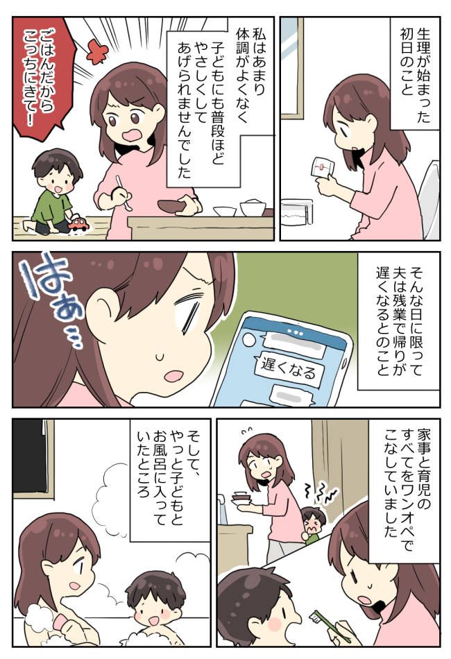 ある月の、生理が始まった初日のことです。私はあまり体調がよくなく、気分が下がってしまっていました。そんな日に限って、夫は遅くまで残業とのこと。ワンオペで育児と家事のすべてをこなしており、息子にも普段ほどやさしくかかわれていなかったと思います。
