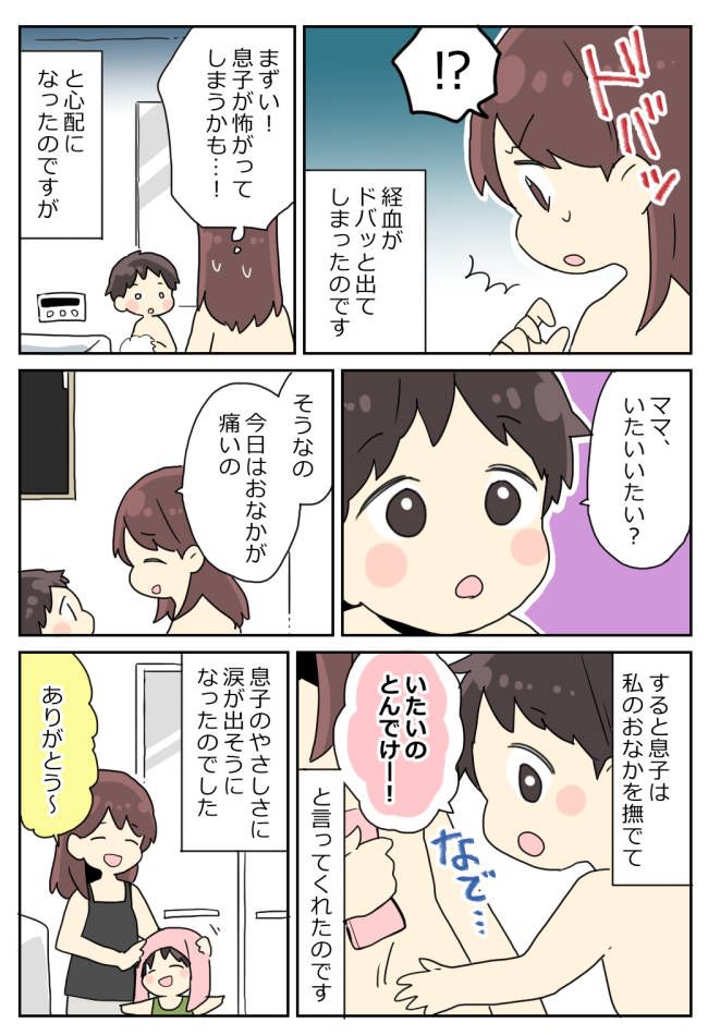 そして、やっとのことで子どもとお風呂に入っていると、経血がドバッと出てしまったのです。息子はまだ2歳で生理が理解できないため、「怖がらせてしまうかも……」と心配になったのですが、息子は「ママ、いたいいたい?」と私に質問。私が「そうなの。今日はおなかが痛いの」と答えると、おなかを撫でながら「いたいのとんでけ!」と言ってくれました。