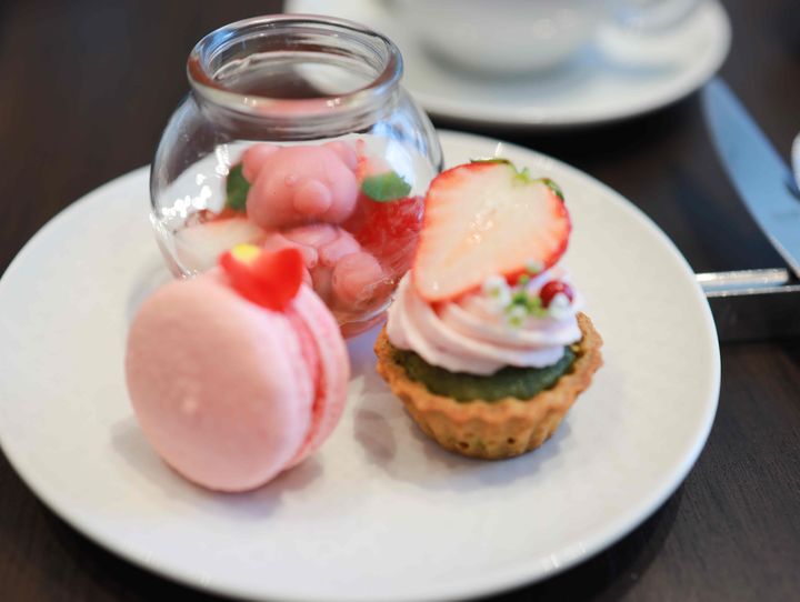 ルビーチョコのガナッシュでできたくまさんが入ったグラスの「ローズヒップベリーティーのジュレ」に、芝生のような抹茶生地に白いお花が添えられた「抹茶といちごのタルト」。一言に“お茶”といっても、レッドやグリーンなどさまざまな色合いと味わいがあるのだと実感します。