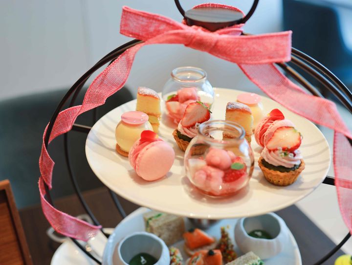 2025年4月11日(金)から6月22日(日)までの土日・祝日限定で提供がスタートしたアフタヌーンティーのテーマは“お茶(ティー)”。世界中のさまざまなお茶を使ったスイーツが並ぶ、爽やかな内容です。ピンクを基調とした淡い色合いのスイーツたちは、初夏を感じさせます。