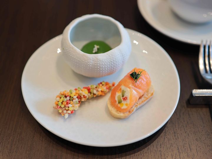卵とフレッシュなアスパラガスの組み合わせが爽やかで、王道の美味しさを感じる「卵とアスパラガスのサンドウィッチ」や、袴田シェフ考案のホタルイカに5色のぶぶあられをまとわせて揚げた「ホタルイカの春の装い」、スモークサーモンの塩味とサワークリームの酸味が絶妙にマッチした、美しい断面の「スモークサーモンのポーピエット」など、グルメなセイボリーを味わいました。