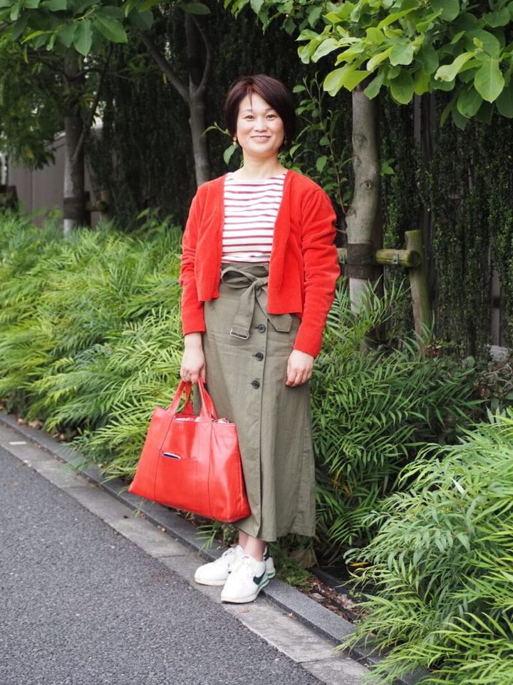 「その日の気分によって洋服を選ぶことが多いですが、なるべく色を取り入れるように意識しています」と、藤田さん。この日は、どんよりとしたくもり空の下で映えるビビッドな赤をちりばめてパワーチャージ。ボーダートップスとカーキのラップスカートを組み合わせ、元気さと落ち着きをミックスした大人のフレンチカジュアルスタイルに。スカートのベルトをアレンジしてメリハリを出す、小柄さんならではの着こなしテクニックも◎。