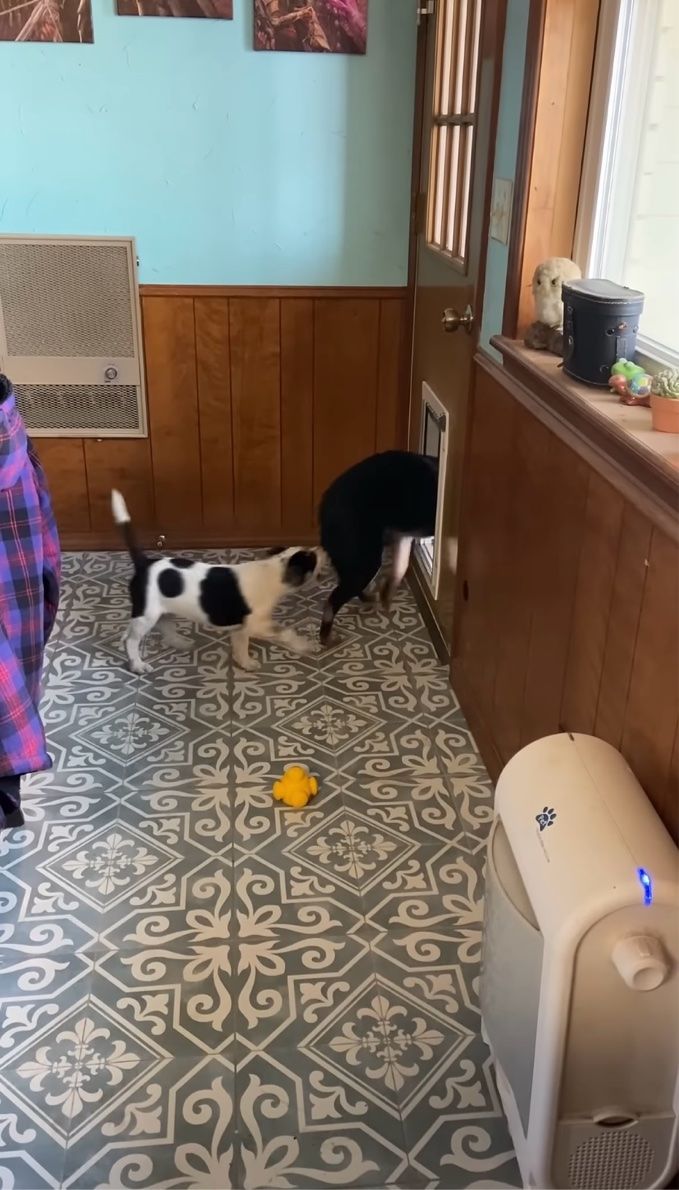 ペットドアをくぐれない子犬。先住犬がお手本を見せてくれても・・困惑している?【アメリカ・動画】