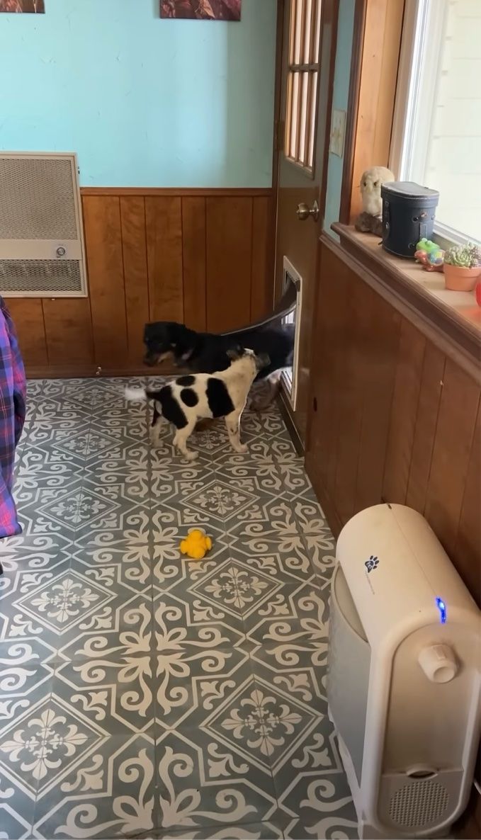ペットドアの使い方がまだわからない子犬。 頼れる先住犬が「ほら、こうやるんだよ」とばかりに、親切なお手本を見せてくれますが・・・!?