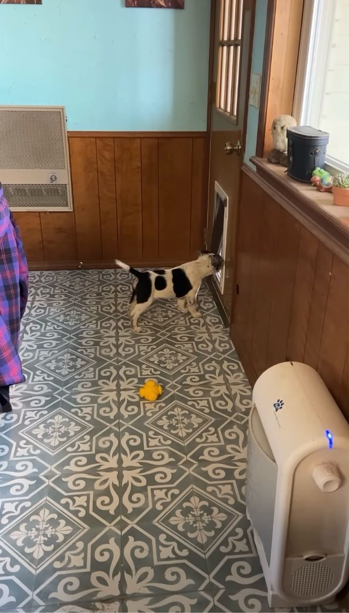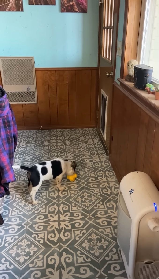 ペットドアを不思議そうに見つめながらも顔を寄せているのは、生後8週の子犬『コスモ』。 このドアをくぐれば裏庭に出られるのですが、幼いコスモにはその仕組みがわかっていないようです。