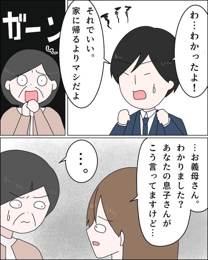 「わ・・わかったよ!それでいい。家に帰るよりマシだよ」夫の言葉に義母は大ショック!そして、「・・お義母さん。わかりました?あなたの息子さんがこう言ってますけど・・」私にそう言われて「・・・」不満そうに黙っている義母。