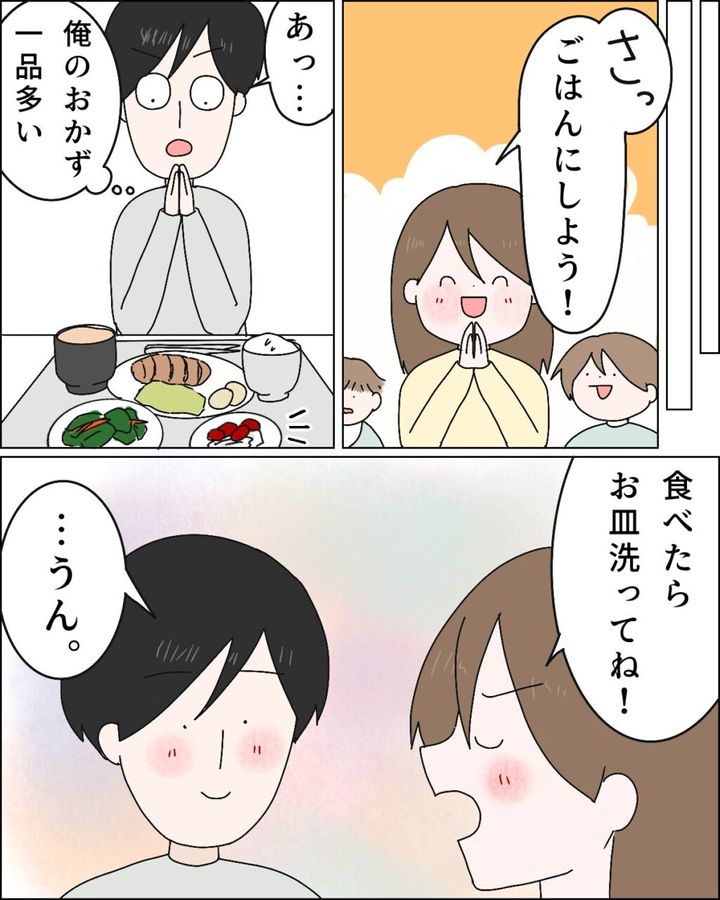 「さっ、ごはんにしよう!」テーブルについた夫が自分の前に置かれた料理を見て、「あっ・・俺のおかず一品多い」と思っているはずの夫に、「食べたらお皿洗ってね!」ちょっぴり照れながらそう言うと、「・・うん」同じく頬を赤くした夫が素直に答えたのでした。