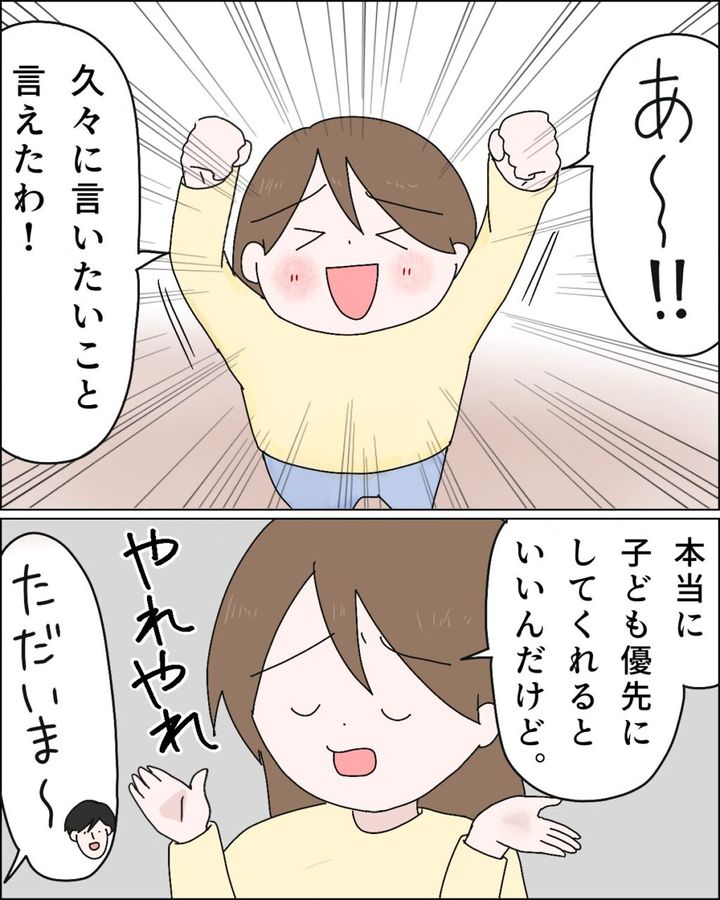 二人が家を出た後、「あ~!!久々に言いたいこと言えたわ!」とうれしくなり思わず両手を上げる私。「本当に子ども優先にしてくれるといいんだけど。」やれやれと思いながらそう呟いていると、「ただいま~」と夫が帰ってきました。