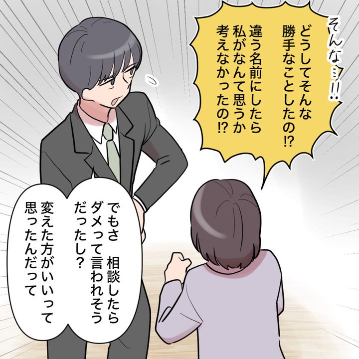 「どうしてそんな勝手なことしたの!?違う名前にしたら私がなんて思うか考えなかったの!?」今まで候補にもあがっていなかった名前。本当に意味が分かりませんでした。どうしたらこんなひどい事ができるの!?「でもさ、相談したらダメって言われそうだったし?変えた方がいいって思ったんだって。」ショウタは、ハッキリしない理由を言いながら目をそらしました。私が反対するとわかっていたから、勝手に名前を変えたんだ。