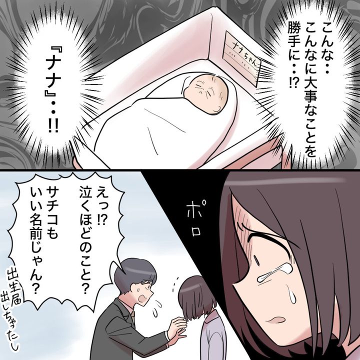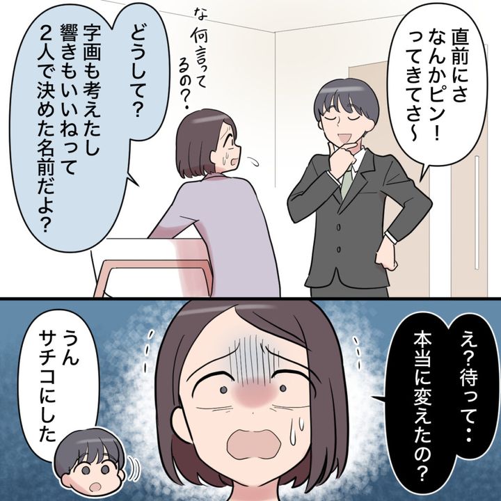 一生懸命考えて決めた「ナナちゃん」という名前。お腹にいる時からずっとそう呼んでいて、もう娘の名前はナナちゃんでしかなかったのに、ショウタの名前を変更したというありえない報告に動揺を隠せませんでした。「どうして?自覚も考えたし、響きもいいねって2人で決めた名前だよ?」と、どうしても受け入れられない気持ちをぶつけました。でも、ショウタはそんな私にお構いなし。自慢げに「直前にさ、なんかピン!ときてさ~」と言うので、「待って・・・本当に変えたの?」とショックで震えました。「うん。サチコにした。」サラリと全然違う名前を言うショウタ。