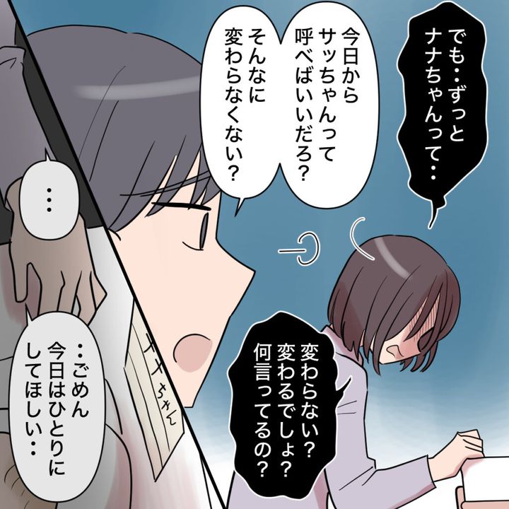 生まれる前から「ナナちゃん」と名付けた娘なのに、相談もなく変更してしまった上に、「今日からサッちゃんって呼べばいい」とは、あまりにもひどいですね。ナエさんが名前の変更を受け入れるには時間がかかりそうです。