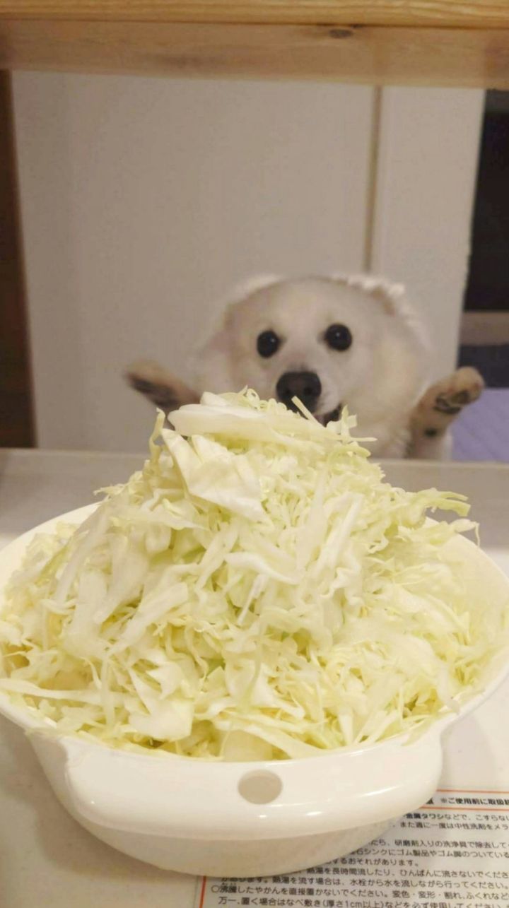 好物のキャベツがテーブルの上にあるのを見つけてしまったワンコさん。くーさんママさんがその姿を激写。撮影できた写真がこちらです。