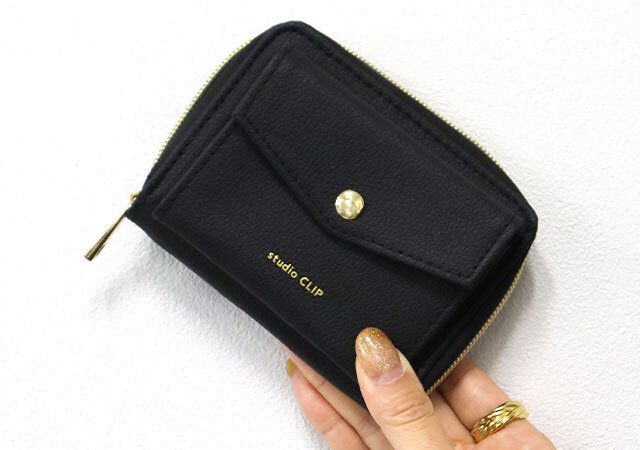 高見えデザインが魅力の「スタディオクリップ」のミニ財布は、黒のレザー調素材にゴールドロゴが映えて上品な印象に。レター風のフロントデザインが大人可愛い仕上がりです。