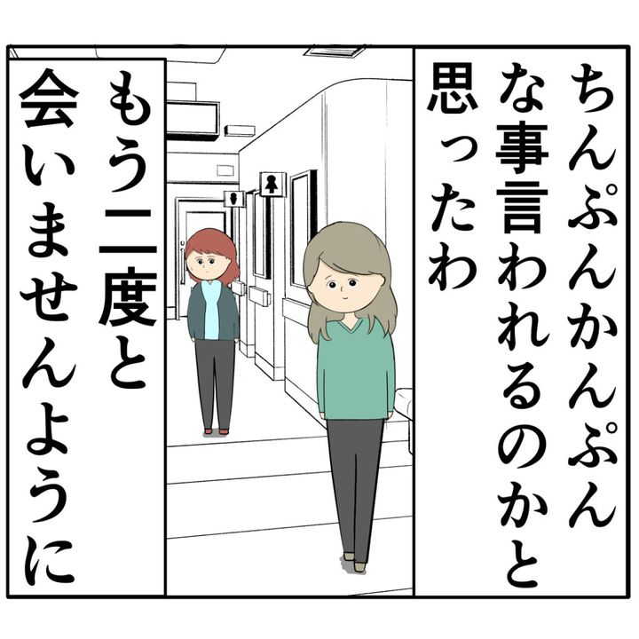 ストレスで入院していた病院の廊下でジュリ実さんのような女性を見かけためいさんは、以前ジュリ実さんに待ち伏せされて訳の分からないことを言われたときのことがフラッシュバックし体が強張りました。ジュリ実さんだと思った女性はめいさんの見間違いで別人でしたが、ジュリ実さんのことで体が拒否反応を示してしまうめいさんは「もう二度と会いませんように」と強く願いました。