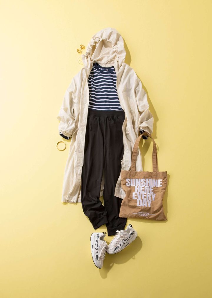 コットンフーデットコート¥12,900<ユニクロ ユー>エアリズムコットンロングTシャツ¥1,990アクティブジョガーパンツ¥2,990<ともにユニクロ>(すべてユニクロ)バッグ¥4,950(ル タロン)シューズ¥15,300(ナイキ スポーツウェア/ナイキ)ピアス¥12,100バングル¥12,100(ともにワンエーアールバイウノアエレ/ウノアエレ ジャパン)