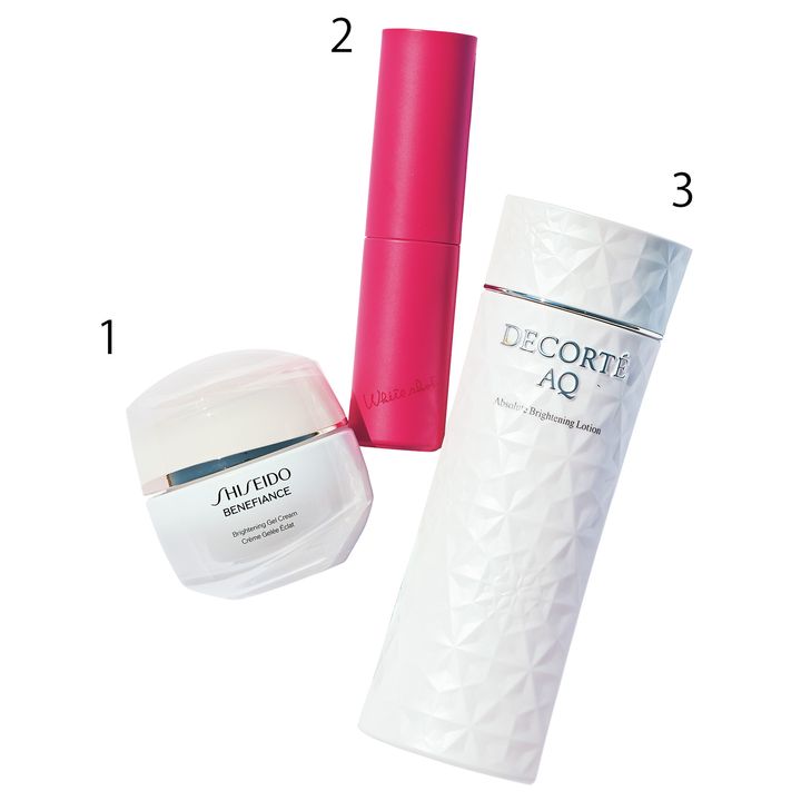 1.肌にスーッと溶け込むベネフィアンスのブライトニングジェルクリーム。2.シミ予防も美白も1本でできるPOLAのホワイトショットフェイシャルセラムはずっと手放せません。3.発売当初からラインで愛用しているコスメデコルテAQアブソリュートローションブライト。肌がもっちりしてトーンアップも叶う。
