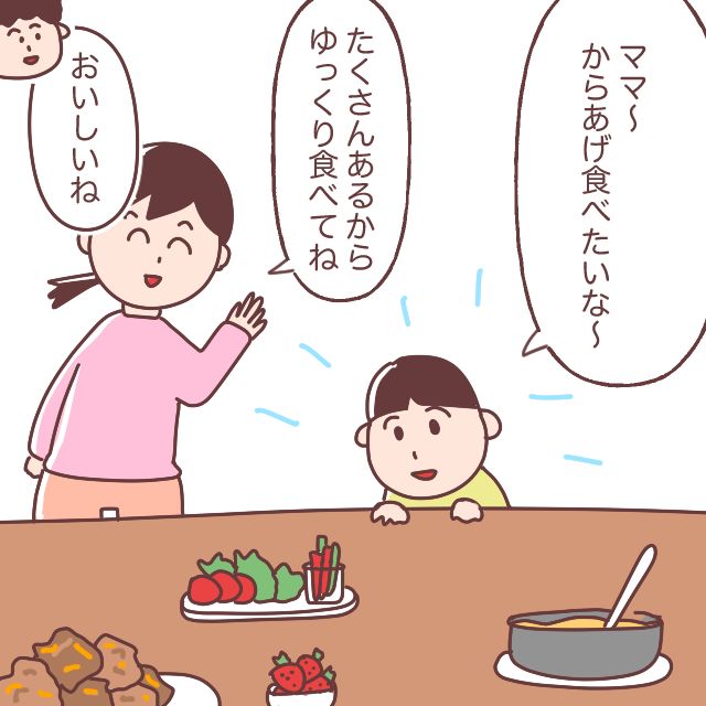 そして、「ママ~、からあげ食べたいな~」ユイトくんはお腹がすいていそう。「たくさんあるからゆっくり食べてね」と言うと、夫も「おいしいね」と言いました。