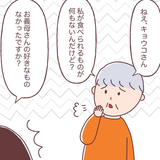 「私はママに特別なことを何もしてもらったことがない」と呟く義母に、「特別なことって・・キョウコの誕生日とかに何かしたことないだろ?」見かねたご主人が憤るのをキョウコさんが慌ててなだめました。その後、「ママ~からあげ食べたいな~」食卓に座り、テーブルの上を見渡すユイトくんに、「たくさんあるからゆっくり食べてね」と声をかけるキョウコさん。一足先に食べていたご主人が「おいしいね」と声をかけ、家族だんらんも時間を過ごしていたところ、「ねえ、キョウコさん、私が食べられるものがないんだけど?」ひょうひょうと言う義母に、「お義母さんの好きなものなかったですか?」とたずねると、「食べるものたくさんあるじゃん。何が食べられないんだよ」とご主人が聞くと、「ムリよぉ~。私にはムリ」ときっぱり答えた後、「ひどいわよねぇ~、ママとパパ・・おばあちゃんにはなーんにも食べるもの準備してくれないの」ため息をつきながらキョウコさんとご主人への文句をつらつらと話す義母。ユイト君はというと、何が起きていたのか全くわからず、頭の中は「?」でいっぱいでした。
