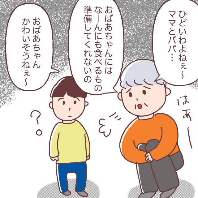 そして、ユイトくんの隣にしゃがみ込むと、「ひどいわよねぇ~、ママとパパ・・おばあちゃんには、なーんにも食べるもの準備してくれないの。おばあちゃんかわいそうねぇ~」そう呟かれたユイトくんには、さっぱり意味がわかりませんでした。