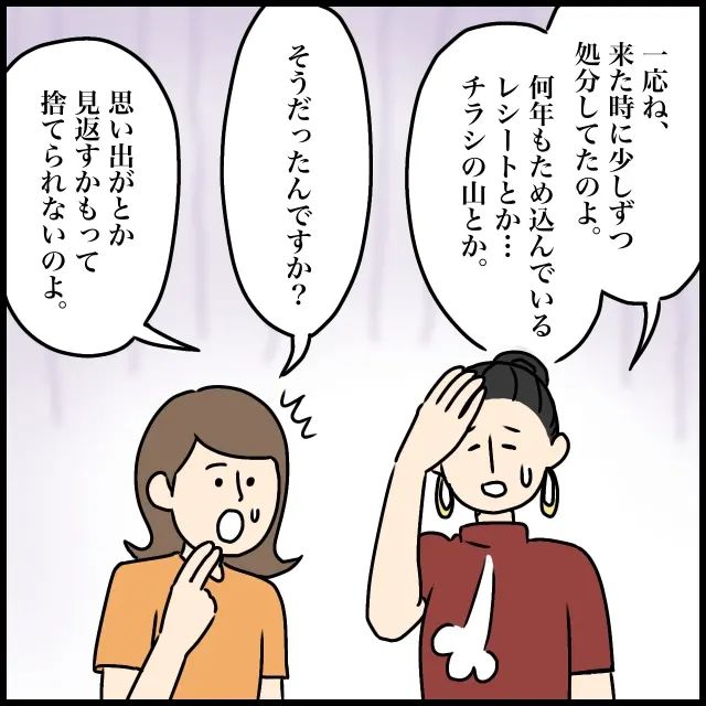 「一応ね、来た時に少しずつ処分してたのよ。何年もため込んでいるレシートとか・・チラシの山とか」義姉の言葉に、「そうだったんですか?」と驚くと、「思い出がとか、見返すかもって捨てられないのよ」