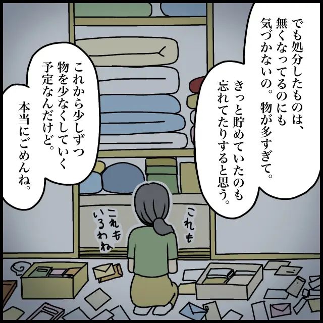 「でも、処分したものは無くなってるのにも気づかないの。物が多すぎて。きっとためていたのも忘れてたりすると思う。これから少しずつ物を少なくしていく予定なんだけど。本当にごめんね」義姉が続けて謝りました。