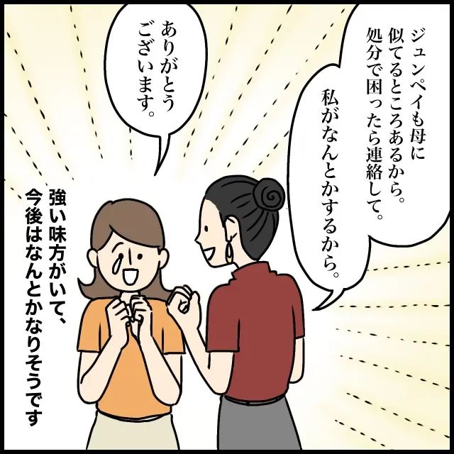 そして、「ジュンペイも母に似てるところあるから。処分で困ったら連絡して。私がなんとかするから」義姉の心強い言葉に「ありがとうございます」とお礼を伝え、強い味方がいて、今後はなんとかなりそう。と少しホッとしたのでした。