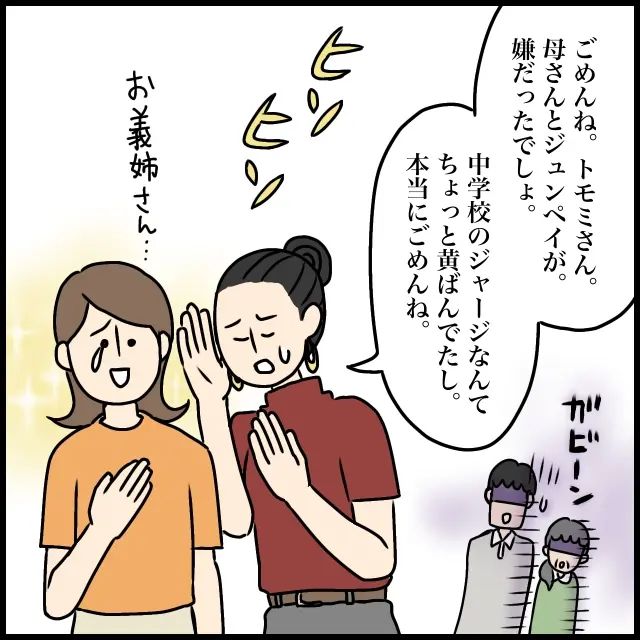 そして、「ごめんね。トモミさん。母さんとジュンペイが。嫌だったでしょ。中学校のジャージなんて、ちょっと黄ばんでたし。本当にごめんね」とヒソヒソ声で言う義姉に思わず感動。そんな風に言われたジュンペイと義母はガビーンと衝撃を受けました。