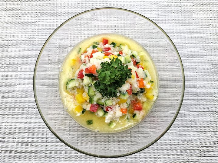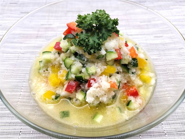 スマホで料理の写真を撮影するとき時々「ブーケ」と表示されることがありますが、このレシピのように器の中に色とりどりの具材が盛られている様子はまさに花束のようです。野菜を全部5mm角に切ったりカリフラワーをすりおろすなど、「もしや?」と思いながら作りましたがやはりカリフラワーをクスクスに見立てたレシピで、わざわざ茹でたのもそのためでした。それぞれの野菜の食感と本当にクスクスのように思えるカリフラワー、そして普通の酢ではなくりんご酢を使ったことでツンとこない爽やかな酸味が全体をバランスよくまとめていて、とても軽くておいしいサラダでした。