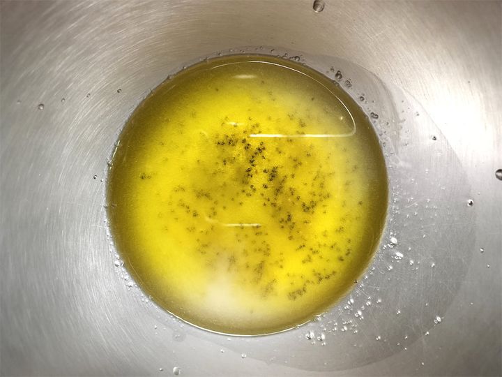 2. ボウルにりんご酢、塩、黒こしょうを入れて、泡立て器でよく混ぜ合わせます。