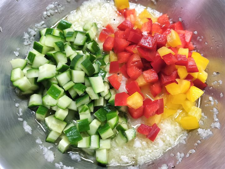 6. カリフラワーの粗熱が取れたら、きゅうりとパプリカを加えてあえます。