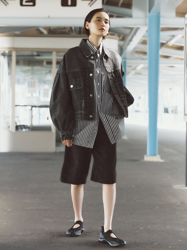 スニーカー[Tabi sandal]¥26,400(タビフットウェア/RHC ロンハーマン)、デニムジャケット¥53,900(ハイク/ボウルズ)、シャツ¥39,600(インディビジュアライズドシャツ/メイデン・カンパニー)、ハーフパンツ¥14,000(COS/COS 青山店)、イヤリング※シングル¥14,850(マユ/マユ ショールーム)