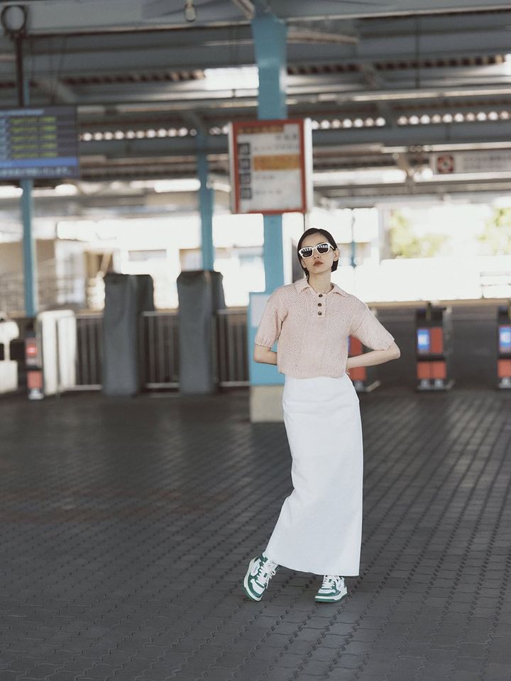 ストリートなムードが強いバッシュはスカートやドレスに合わせるのが最適解。あえて靴と服のテンションをズラすのが、おしゃれに見せるポイントです。
