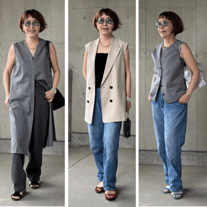 【50代ファッション】おしゃれ迷子さん必見!「ジレ×デニム」でいつもの着こなしを手軽に格上げ!お手本コーデ3選【素敵世代のデニムコーデ】