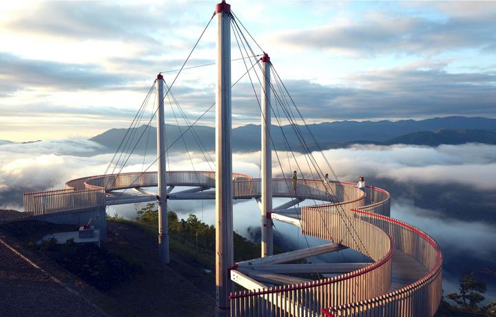 空中にせり出した造りで、雲の形をしています。およそ210度の広大な景色を見渡すことができ、歩行距離は 57メートル、高さは最大約10メートルです。吊り橋のような構造で、歩くと少し揺れるので、景色を眺めながら雲の上をふわふわと歩いているような気分を味わえます。