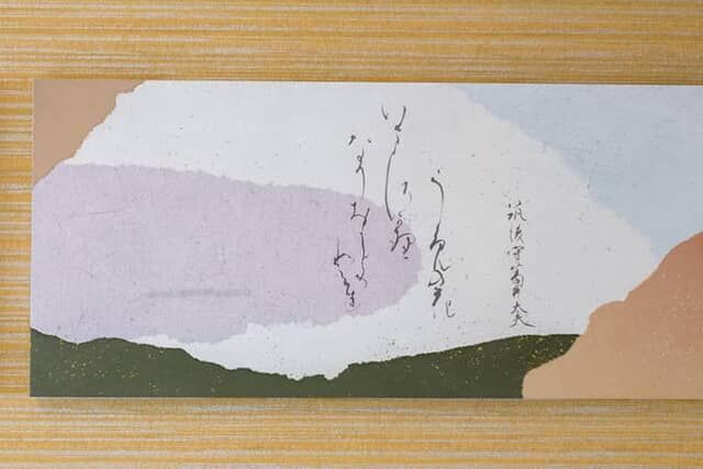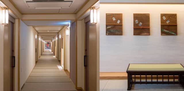 館内は畳敷きで、フロアごとにテーマが設けられ壁や客室の扉の色が異なります。エレベーターホールには百人一首を添えたアートが飾られていて、春をモチーフにした6階では、春を詠んだ歌が選ばれていました。