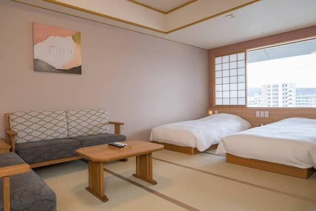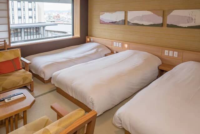 3台設置したベッドは幅100cm×縦200cm。広い窓があるのも開放的で嬉しいです。温泉大浴場があるのでバスタブがあるのは一部の客室のみ。基本的にはシャワーブースを備えています。