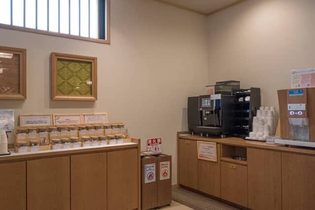 ロビーの一角では6時から24時までコーヒーやお茶などを用意。お茶やほうじ茶のほかに、アールグレーや白桃ピーチなどがありました。