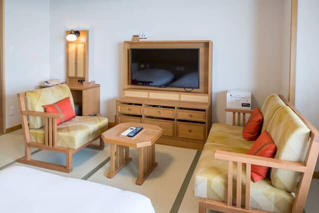 ソファーやテレビキャビネット、化粧台などは木製の落ち着いた雰囲気です。