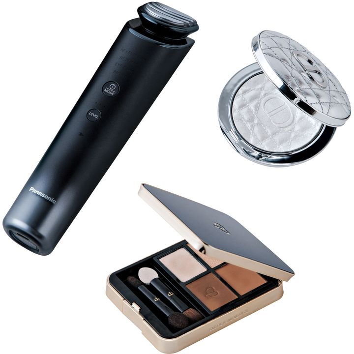 左:パナソニックのバイタリフト RFは美容液を導入したり、シートマスクの効果を高めるために、母娘で毎日愛用。リフトアップモードで肌の引き締めもできるのが◎。上:発売時に一緒に見に行き、パッケージの可愛さと粉の輝きに、ふたりで一目惚れしたDIOR スキン フォーエヴァー グロウ ルミナイザー 06。自然な発光肌が叶います。下:瞼にツヤと輝きが増すクレポのオンブルクルールクアドリ 2番。少量でもキレイに発色して、持ちも◎。私はデイリー、娘は特別な日に使用。