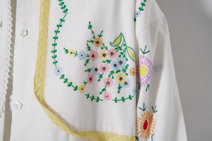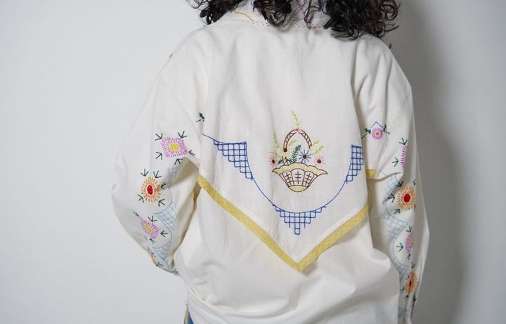 「古着屋さんにあるヴィンテージのシャツジャケットを目指してつくったシャツ。色鮮やかな刺しゅうを贅沢に施し、染めたレーステープなど、細部までこだわりを詰め込みました。
