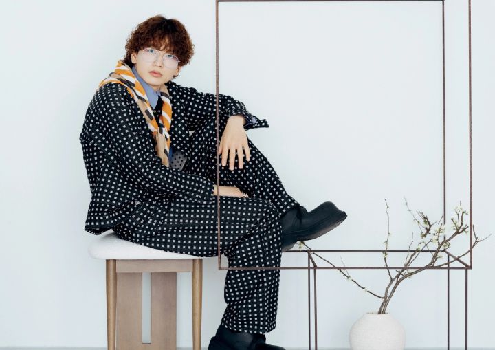 ジャケット¥69,300、シャツ¥46,200、パンツ¥49,500/以上PEVERBERATE(イーライト) シューズ¥15,360/ASCLO(SPES PRESS) 眼鏡¥19,800/メッシーウィークエンド(ジョワイユ) スカーフ¥8,690/sub lime roe(ティーニーランチ) ネックレス¥198,000/スキャット イヤカフ¥24,200、リング¥7,1500/ともにガルニ(ガルニ東京店) その他/スタイリスト私物