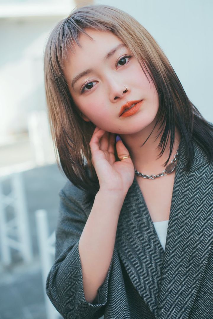 髪色はシックだけど、しっかり攻めた個性派長めボブ。顔まわりにハイレイヤーを入れ、前髪はオン眉2㎝×ザクザクのベビーバングに。全体をブリーチ後、クリーミーベージュでカラーし、毛先にのみ暗めのチェスナッツブラウンのエンドカラーをオン。少量のバームとオイルを混ぜて、バサッとドライな仕上がりに。