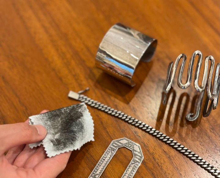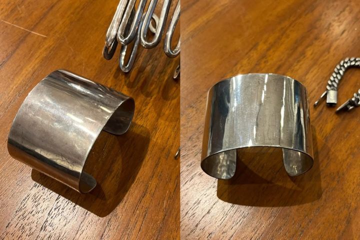 その方法を安武さんに聞いてみると、「シルバー専用のクロスで磨くのがオススメです! 」とのこと。「シルバーの黒ずみを落とす方法はいろいろありますが、一番簡単なのが専用のクロスです。100円ショップや無印良品などで購入できますし、テレビなどを観ながらでも磨ける手軽さもイイんです。ひと拭きでも結構クロスが黒ずむので磨きがいもありますよ(笑)。ただ、素手でやると手も汚れるので(洗うと落ちますが)、気になる方はグローブをつけたほうがいいかもしれません」