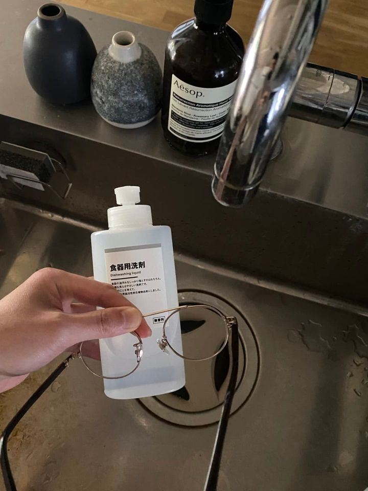 「メガネ店を取材した知り合いの編集者から聞いたのですが、レンズの皮脂汚れには台所用の中性洗剤が使えるんです。もちろん眼鏡クリーナーでもいいですが、家にあるモノで手軽にお手入れできるのはかなりポイントが高いですよね。その方法も簡単で、指先に洗剤をつけて眼鏡の両面を優しく撫でながら洗うだけ。驚くほど皮脂汚れが除去できるので、ぜひ試してみてください! 」