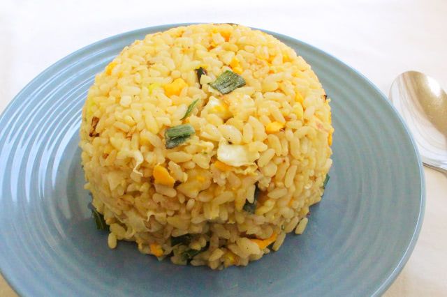 小さめの丼に炒飯を詰め、お皿を被せてひっくり返し、お店の炒飯っぽく盛り付けました。
