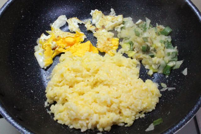 4. 目玉焼きを木べらなどで粗く崩し、2を加えて、強めの中火にします。ご飯を切るようにして、炒めます。